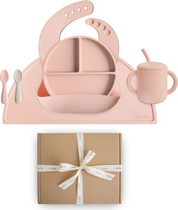 Make meals with for you and your little one a little easier with this six-piece set of silicone self-feeding essentials. The kit includes everything toddlers need to develop coordination and confidence when self-feeding. The Spoons are sized perfectly for small hands, while the Training Cup and Straw help build up fine motor skills and transition littles from bottle to cup. A bib catches crumbs and a placemat gives your child plenty of room for food exploration at the table. The section suction plate stays put so you don t have to worry about meals tipping. Each piece is crafted from high-quality, food-grade silicone that s easy to clean.
