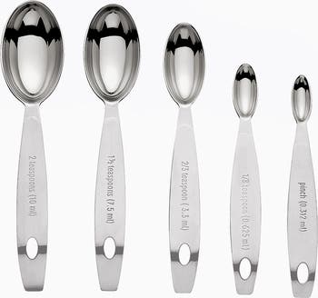 Recommended by professionals, our innovative set of odd sized measuring spoons fit together neatly and are held together with a simple storage clip. These superb nesting measuring spoons are oval to reach into the smallest spice jar. The gently curved handles curl under, so the spoons can sit securely on the counter without tipping over.