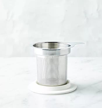 Samovar Tea stainless steel tea infuser with a white lid. Unisex stainless steel construction provides a simple, compact option for daily tea brewing.
