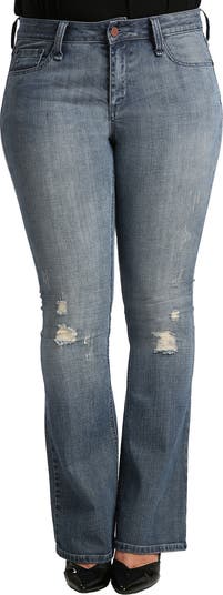 Heavily faded and shredded at the knees, stretch-woven jeans take on well-worn appeal while offering a flattering, figure-elongating bootleg silhouette.