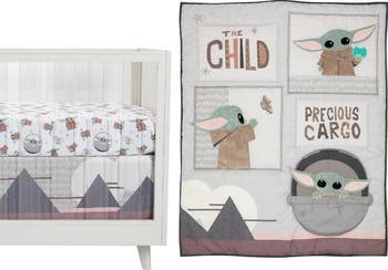 The Child aka Grogu and Baby Yoda is so cute and sweet even down to his tiny little feet. Your little padawan (Jedi-in-training) will love this amazing officially licensed Star Wars Mandalorian 3-piece nursery bedding collection which includes one quilt, one fitted crib sheet and one crib skirt. Unique patches on the quilt feature The Child/Baby Yoda in his taupe colored minky robe. His body is appliqued with minky and velour fabrics. His face is expertly embroidered, and his large eyes and inner ears are appliqued. The fitted crib sheet is made of a soft microfiber material and features The Child in several different poses including in his pod. The words “The Child” are scattered around this crib sheet and there is elastic all the way around ensuring a safe and secure fit on a standard size crib mattress measuring 28” X 52”. The 14 ½” crib skirt adds the finishing touch to your child’s crib. Made of a soft microfiber it features three mountains and cream-colored planets.