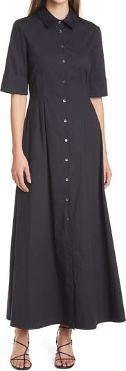 A tailored maxi shirtdress in crisp, stretch cotton features princess seams for a close fit through the bodice and a full, flared skirt.