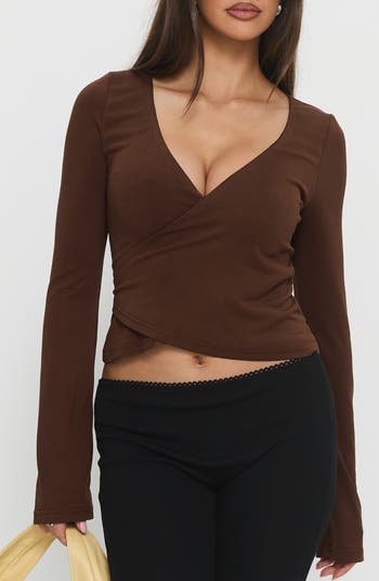 A faux-wrap front shows some skin on a body-skimming soft jersey top cinched with a tie at the back.