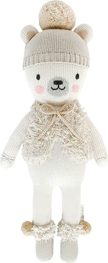 A sweet polar bear toy hand knit from soft Peruvian cotton dons cold-weather garb so they can be even more cuddly for your little darling to play or snuggle with.