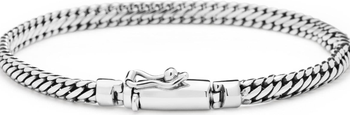 This bracelet features a 4mm band and a lock crafted from 925 sterling silver. Handmade in Los Angeles, its slim design and easy-to-open clasp make it ideal for everyday wear and a versatile base for stacking with other bracelets. Each piece is uniquely crafted by hand and may vary slightly in size, shape, and color.