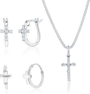 Embrace your faith in style with this stunning sterling silver cross collection! This versatile set features delicate cross earrings in two designs—classic 5mm huggie studs and sparkling 17mm crystal-adorned huggies—perfect for mixing and matching your look. The centerpiece is an elegant 8x16mm Jesus cross pendant on an 18-inch box chain that sits just right. Crafted from genuine 925 sterling silver and completely lead and nickel-free, these pieces are safe for all ear types and designed to be worn endlessly. Whether you re dressing up for a special occasion or adding a meaningful touch to everyday wear, this collection lets your spirituality shine through beautifully.