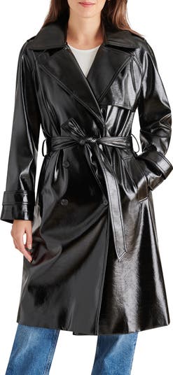 The swaggy moto and the classic trench combine in a faux-leather coat cut in a longline silhouette shaped with a waist-defining tie belt.
