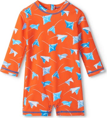 Keep baby s skin protected from the sun, sand and surf in this one-piece rashguard swimsuit that s framed by long sleeves.