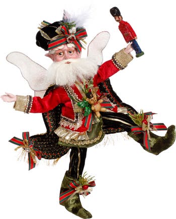 The Mark Roberts Stocking Stuffing Fairy stands delightfully poised, holding a beautifully detailed nutcracker in its hand. Dressed in festive fabrics, sparkling trims, and whimsical accessories, the fairy brings a sense of magic and holiday charm to any display. Its expressive face and intricate craftsmanship make it a captivating centerpiece for Christmas décor.