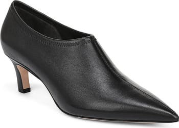 A pointy toe and concave kitten heel bring sharp angles and dimension to a streamlined leather bootie featuring premium underfoot cushioning for lasting comfort.