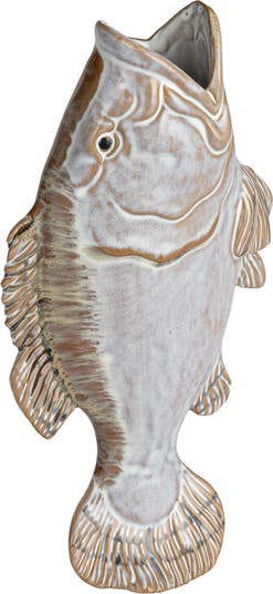 - A charming and unique vase that features a fish shape and a reactive glaze in white and tan color