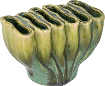This Stoneware Sculptural Vase features 6 sections and a reactive glaze in a vibrant green color, making it a unique addition to any decor. Perfect for garden, farmhouse, boho, and French country styles, this vase adds a touch of artistic flair to any space. Made of durable stoneware with a reactive glaze finish, it is both durable and easy to clean. Ideal for displaying small flowers, succulents, or as a standalone decorative accent, this vase measures 4.25 inches in length, 2.5 inches in width, and 3 inches in height, offering both beauty and functionality. The sculptural design of this vase adds visual interest and texture to any room, making it a versatile piece for any home. Whether used as a centerpiece on a dining table or displayed on a shelf, this vase is sure to make a statement in home decor.