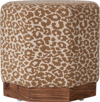 - A stylish stool ottoman featuring a brown and cream leopard print pattern with a stained finish