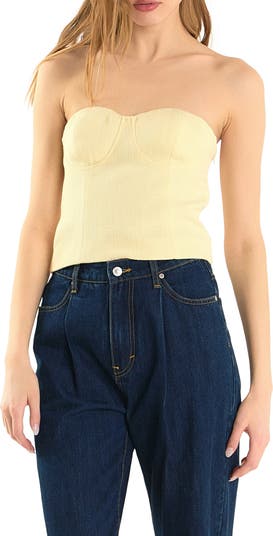 Textural tweed brings unexpected polish to a corset-inspired top fashioned in a strapless, fitted silhouette that s easy to layer over or show off solo.