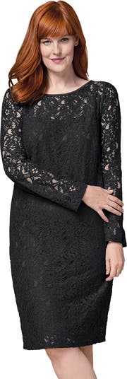 Polished shift dress in elegant lace layers over a solid attached slip with a sweetheart neckline. Lace long sleeves and covered button-and-loop closure at the back of neckline.