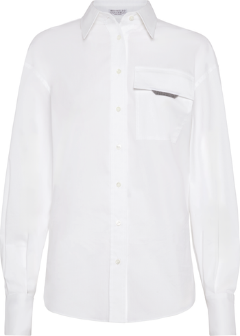 - Placket closure with mother of pearl buttonsClassic collarChest pocketCuffs have one mother of pearl buttonNickel-free monili decoration