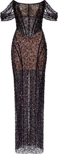 Eye-catching sequined fitted maxi dress with semi-sheer lace, boned corset bodice, lace-up back, detachable off-the-shoulder sleeves, and a figure-skimming silhouette.