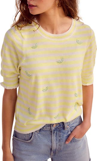 Sunny citrus-hued stripes complement the delicious beading on this lightweight sweater framed by puff sleeves and smocked-and-frilled cuffs.