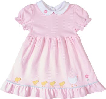 Sweet and storybook-inspired, this dress is crafted from pink and white yarn-dyed mini stripe interlock knit in soft 100% cotton—perfect for warm, sunny spring celebrations. Along the hem, appliqué flowers, a mama hen, and her baby chicks create a charming scene full of playful detail, while a white Peter Pan collar finished with an appliqué flower adds a timeless touch. Puff sleeves with ruffled hems and a skirt ruffle trimmed with ric rac give the silhouette gentle movement and texture. Finished with a back invisible zipper and back waist spaghetti ties for an easy, polished fit, this dress is made for spring celebrations, and picture-perfect moments in the sunshine.