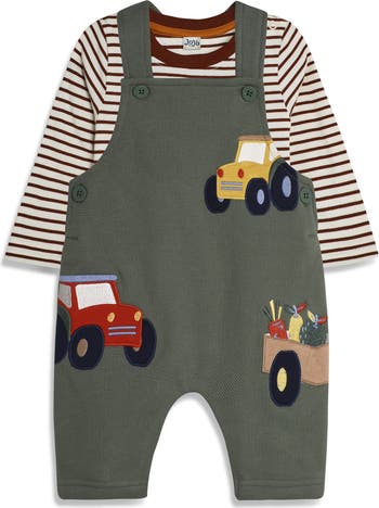 • Overalls have shoulder button closures; side button closures; back patch pockets