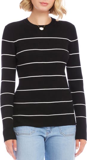 Timeless stripes bring contemporary energy to a fitted, ribbed crewneck sweater knit from lightweight yarns.