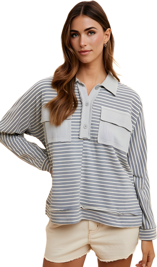 This striped long sleeve top from Knit Lounge brings a fresh, modern twist to a classic silhouette. Featuring horizontal stripes throughout, it s detailed with contrasting textured patch pockets and a tonal yoke that adds just the right amount of structure. The soft knit fabric keeps it comfortable, while the drop shoulders and relaxed fit give it a laid-back edge. Finished with a button-front placket, it s your effortless go-to for casual days or elevated layering.