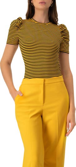 - Short-sleeve striped blouse with a round neckline.