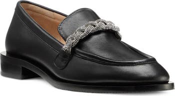 A braided, jewel-embellished vamp strap adds a dose of glamour to a sophisticated leather loafer set on a low stacked heel.