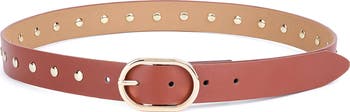 Glossy studs create a bold aesthetic on a rich leather belt fastened by an oval buckle that adjusts for a customized fit.