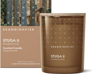 Birch bark and woodland mosses, nutmeg and incense. A perfume and Swedish rapeseed wax blend in painted glass with a pure cotton wick and engraved beechwood lid. Packaging card from managed Nordic forests with water based colour dyes. 200g. Up to 50 hours. STUGA - Swedish for ‘cabin’ To be nestled inside a wooden cabin deep in the wilds is to experience a connection to nature so pure and raw that one’s senses are never more alive.