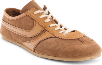 Sleek and low, this mixed-leather sneaker takes its design cues from the world of vintage running shoes and its style cues from the realm of casual comfort. T-toe construction and a gum-rubber sole bring sporty details to the wear-with-practically-everything look.