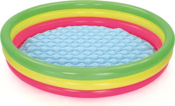 H2OGO! SUMMER SET PLAY POOL - The Bestway Summer Set Play Pool is the perfect place for kids to splash about and cool off in the summer sun with friends and family. Easy to set up, the play pool s three air chambers can be quickly inflated via an air pump (not included). The multi-colored, 3-ring construction is not only eye catching but adds stability and durability. The inflatable flooring offers a nice amount of padding when on harder ground. Dimensions: 60" x 12". Water capacity: 56 gal. Repair patch also included. ENDLESS SUMMER FUN: Little kids and toddlers can enjoy swimming and splashing in Bestway s Inflatable Kiddie Pool. It s the ultimate pool for backyard convenience with minimal setup! Great for families with younger children. There s an inflatable floor padding to add stability, durability and extra cushion for your children as they splash and play. MADE TO LAST: A durable, yet lightweight PVC material provides structural integrity to your pool. It s tear-resistant and won t fade overtime to sun exposure. Use this pool summer after summer! EASY TO ASSEMBLE: Just select a level surface, inflate the pool in under 3 minutes, fill with water from a garden hose, and get ready for summer fun in no time! GREAT FOR BEGINNERS: This kids pool is great for young swimmers who are gaining their confidence to swim in deeper and larger pools. DRAINS QUICKLY: At the end of the season, closing the pool is a breeze! A built-in flow control drain valve attaches to a garden hose to drain away water.