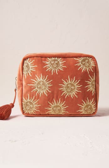 This wash bag is inspired by the warm wonders of our sun. Complete with Elizabeth s hand-drawn sun motif emblazoned onto a crisp cotton canvas or velvet, with intricately embroidered gold.She has depicted the sun with a human-like face, based on imagining the sun as a character. Our Wash Bags feature an elegant zip tassel, handy inner pockets, and a waterproof lining, perfect for keeping your beauty products looking pretty on your dressing table or bathroom shelf.