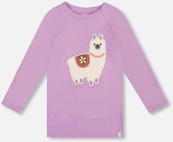 Our Brushed Jersey Tunic Purple With Llama is soft, cozy, and topped with a touch of llama fun. This long sleeve tunic is crafted from ultra-soft brushed jersey and features raglan sleeves, a straight comfortable fit with side slits, a round neckline and a playful textured llama appliqué on the chest. Designed for girls who love sweet details, it’s a comfy go-to for pairing with leggings or jeans.