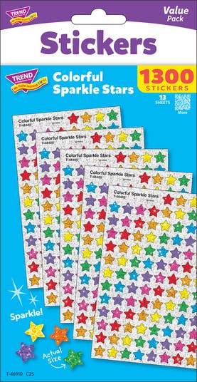 SUPERSHAPES: COLORFUL SPARKLE STARS - STICKER PACK 1300CT - These classic little SuperShapes Stickers are fun for student rewards and on homework folders, and just the right size for Incentive Charts and Incentive Pads - pixels of encouragement and accomplishment. For craft projects, greeting cards, bulletin boards, and signs, they add color and motion that attracts the eye. In the office, they fit perfectly on file folder tabs; mark dates on calendars; and stick to invoices and statements to get clients attention! They re acid-free, nontoxic, PFAS-free, and photo-safe, making them a perfect choice for scrapbooks, classroom projects, and creative fun at home. Designed to last without damaging surfaces or fading over time. TREND: We make learning fun! OVERVIEW: Mini sticker sparkle stars. 7 colors (blue, red, yellow, green, orange, purple, pink), 1,300 stickers with 100 assorted stickers per sheet. Acid free, non-toxic, and safe for photos. Proudly designed and printed in Minnesota, USA.