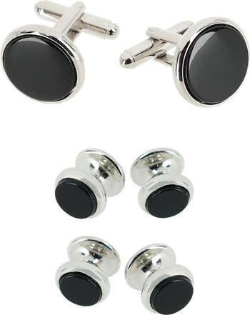 Polished black-onyx insets further the classic, versatile appeal of this wardrobe-staple set of two cuff links and four matching shirt studs.