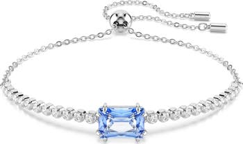 Clear Swarovski zirconia lead to a colorful center baguette that adds an elegant pop of color to this adjustable slider bracelet.
