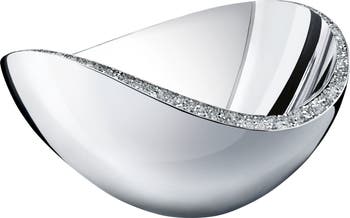A stunning piece for a side table or shelf, this gleaming silvertone bowl in a fluid organic shape is enriched with glittering crystals set around the rim.