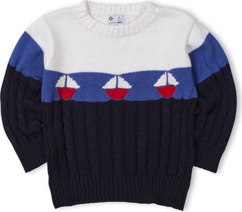 Charmingly classic, this sweater by Florence Eiseman features textured intarsia sailboats on navy, blue, white, and red sweater knit. A cozy cable-knit lower section pairs beautifully with crisp white neck ribbing and navy sleeve and body hems. Machine washable sophistication ideal for layering.