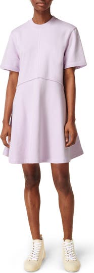 Seamed raw edges trim the waistline of a delicately flared T-shirt dress created from a stretchy cotton blend that moves with you.