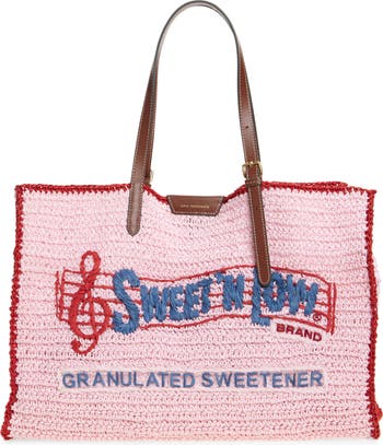 A raffia-embroidered sweetener logo sweetens the look, without increasing the calorie count of this crocheted east/west tote. Topped with adjustable leather straps, it boasts a roomy interior for all your vacation or around-town essentials.