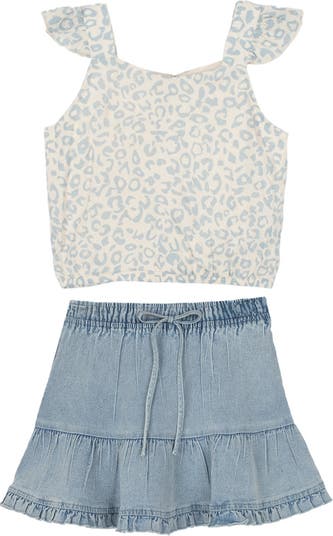 - This girls 2PC set features a flutter-sleeve top with a soft ivory base and delicate blue leopard print for a stylish touch. Paired with a tiered denim skirt featuring an elastic waistband and drawstring details, this set blends comfort and fashion, making it perfect for casual outings and everyday wear. Fabric Care 65% COTTON 35% VISCOSE 80% COTTON 18% POLYESTER 2% SPANDEX Machine Wash Cold