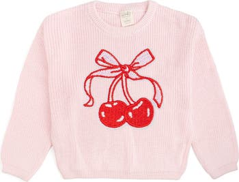 This pink sweater is bursting with cuteness, topped off with a big cherry-and-bow design that’s as sweet as she is!