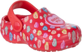 Add a bold pop of love to your toddler s wardrobe with these officially licensed Sweethearts red clogs for girls! Featuring vibrant red coloring and iconic candy heart graphics, these clogs deliver playful charm and everyday comfort. Made with lightweight, durable materials, they include breathable ventilation holes and a secure back strap—perfect for active toddlers. Whether for playtime, daycare, or family outings, these easy-to-clean clogs are designed for little feet that love to move in sweet style.