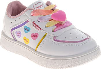 Add a sweet touch to your toddler’s steps with these officially licensed Sweethearts lace-up white shoes for girls. Designed with inspiration from the iconic candy hearts, these sneakers feature playful pastel accents and colorful heart-shaped messages that celebrate fun and love. The classic white base keeps them versatile for any outfit, while the lace-up design ensures a secure, adjustable fit for growing feet. Perfect for everyday adventures, special occasions, or Valentine’s Day fun, these shoes combine charm, comfort, and durability in one adorable pair.
