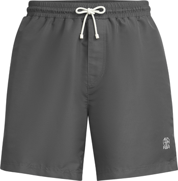 - Elastic waistband closure with external drawstringVertical front pocketsBack pocketSwimsuit bag