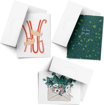 - Card 3 artwork: Floral envelope "thinking of you," Blank inside