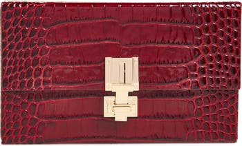 A house-signature flip lock subtly shaped like a T centers this structured East/West clutch crafted from glossy, croc-embossed Italian leather.