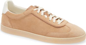 A goldfoil crest logo glints at the contrast counter of a minimalist sneaker crafted from velvety Italian suede with an athletic T-toe.