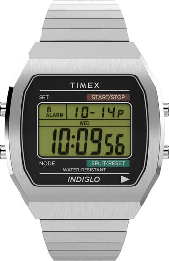 An easy-to-read digital display complete with INDIGLO® lighting boasts the date, an alarm and stopwatch capabilities within a sleek, retro bracelet watch.